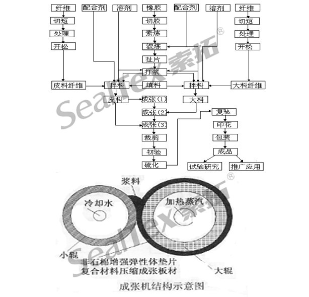 抄取工藝是一種類似造紙工藝的方法,當(dāng)初是在美國研發(fā)成功,用以生產(chǎn)石棉密封材料。美國的阿姆斯壯 Armstrong World Industry于80 年代研發(fā)成取代石棉的無石棉密封材料后,便一直使用抄取工藝而成為全球軟墊片材料的供應(yīng)商。用抄取工藝生產(chǎn)無石棉墊片材料在中國還是個新興工藝。在國內(nèi)的墊片材料的供應(yīng)商中,不到 10 家公司能成功生產(chǎn)真正不含石棉的無石棉墊片材料。下圖顯示的是生產(chǎn)無石棉墊片材料使用的抄取法工藝流程: