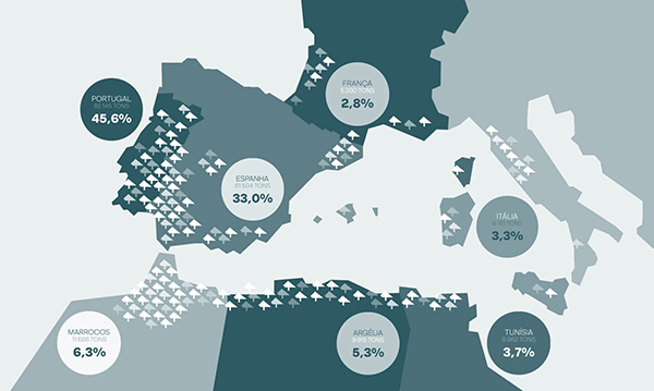 軟木橡樹主要集中分布在地中海沿岸地區(qū),特別是伊比利亞半島。其中: